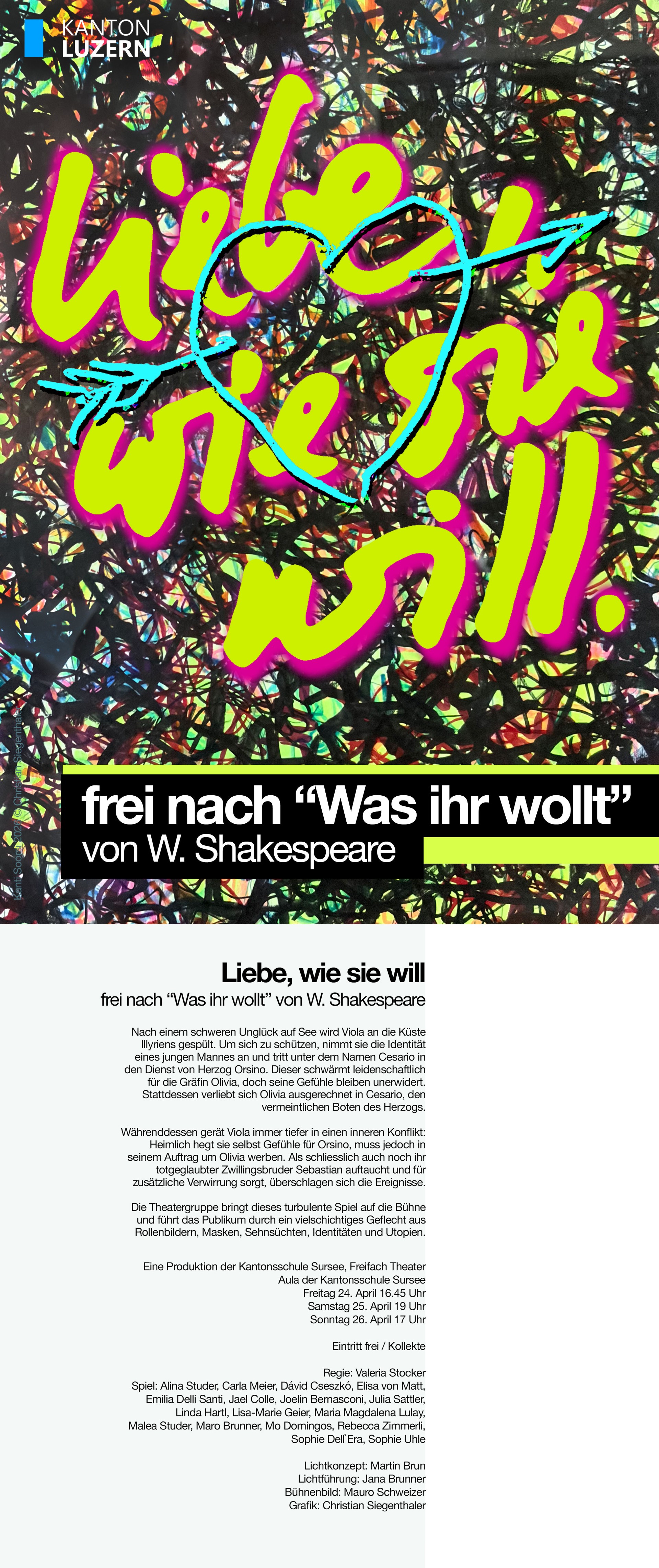 Unter der Regie von Valeria Stocker bringen die Schülerinnen und Schüler des Freifachs Theater dieses turbulente Spiel auf die Bühne und führen das Publikum durch ein vielschichtiges Geflecht aus Rollenbildern, Masken, Sehnsüchten und Utopien.